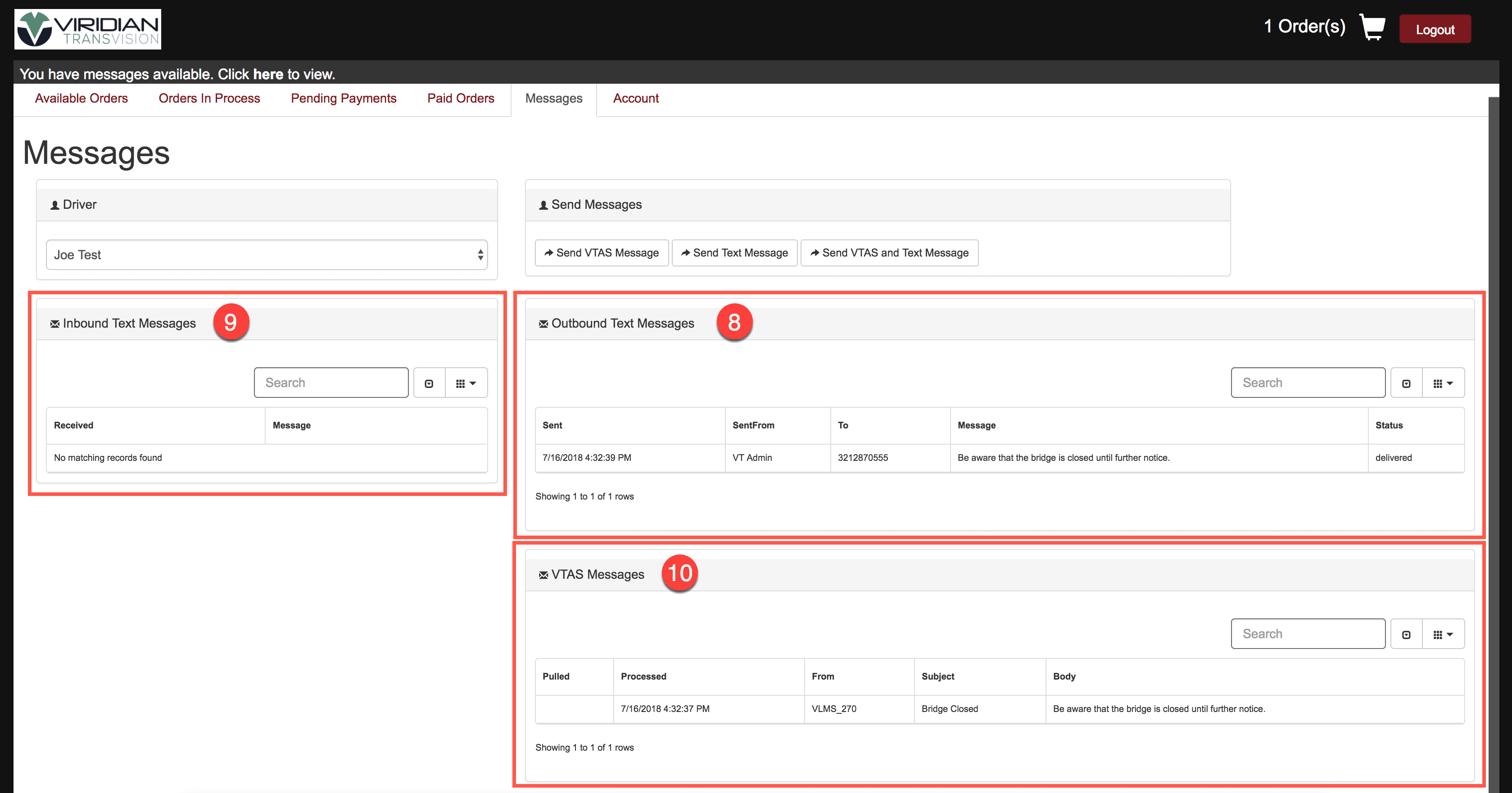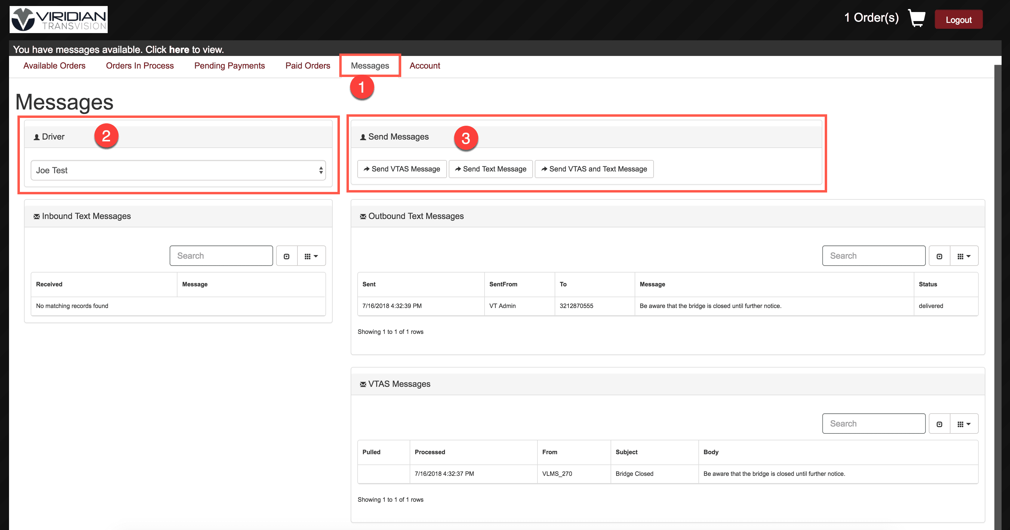 Messages to drivers can be sent from Carrier Interface as either a text message, an in-app V-TAS message, or both. Driver responses and message histories can also be viewed here.