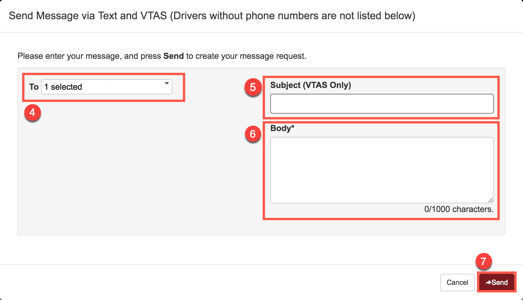 NOTE: Drivers without phone numbers will not be listed in the dropdown for text messages. To add a phone