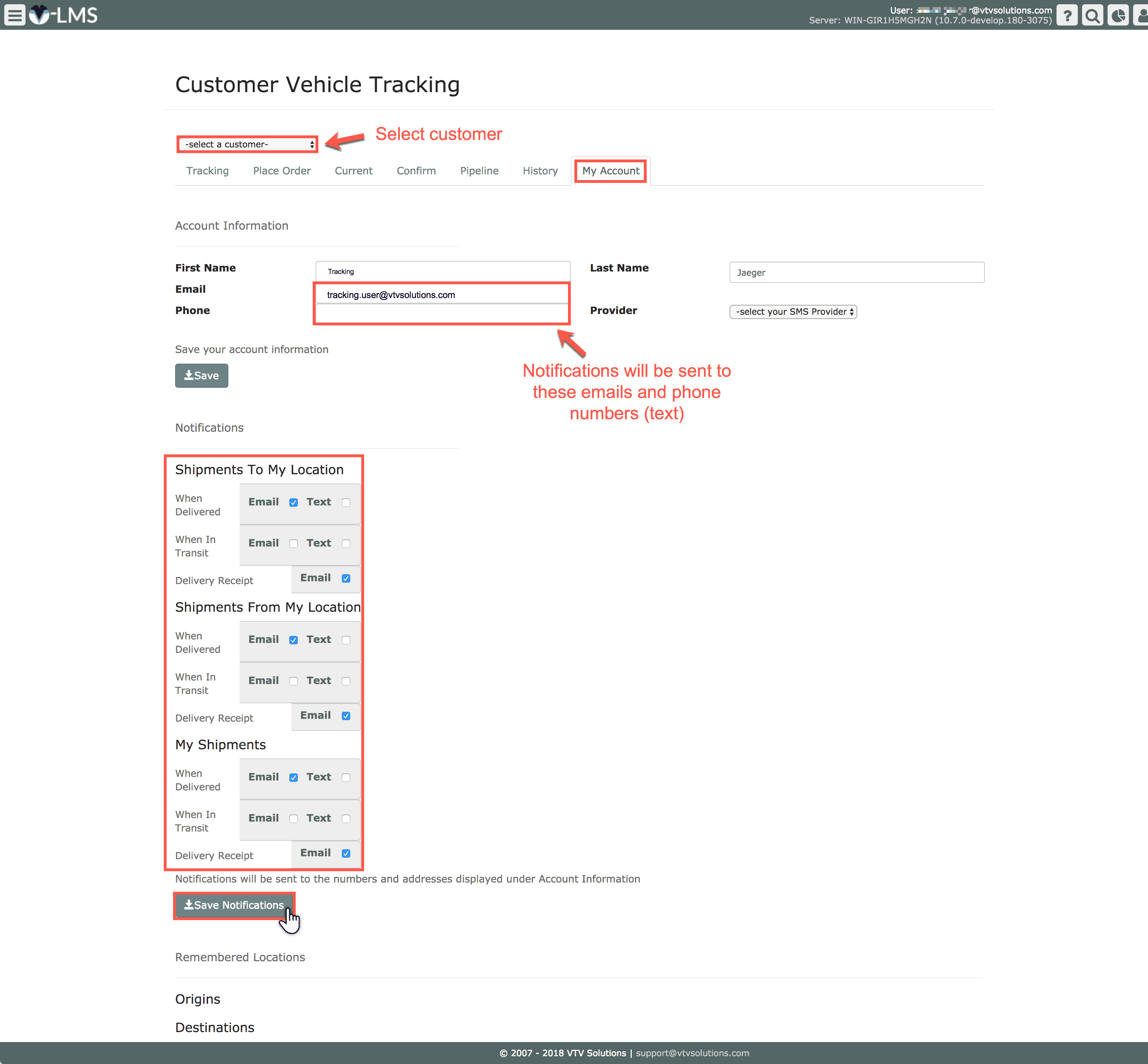 6. To change your notification settings for another customer select that customer from the list and repeat steps 3-4.