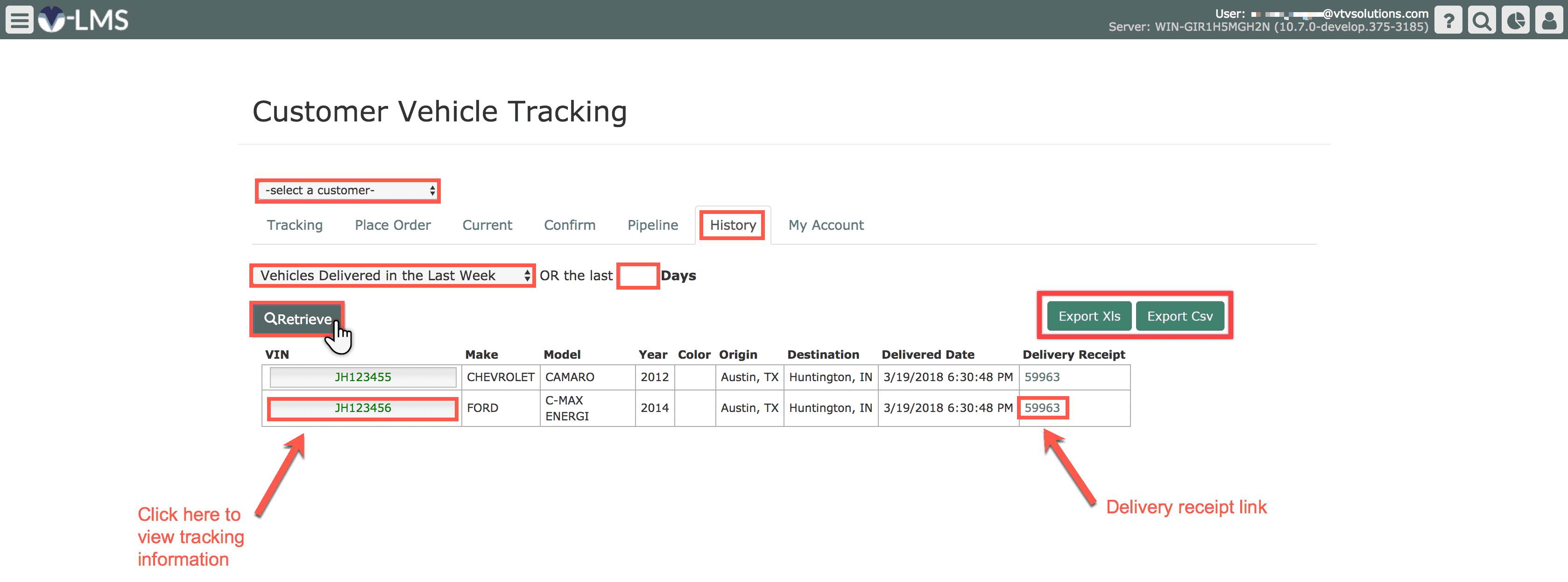 5. Click on the VIN numbers to view tracking information for that VIN.