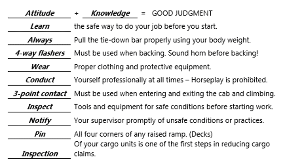 - When walking inside the trailer, decide where to place your lead foot before stepping. Maintain three points of contact, whenever possible.