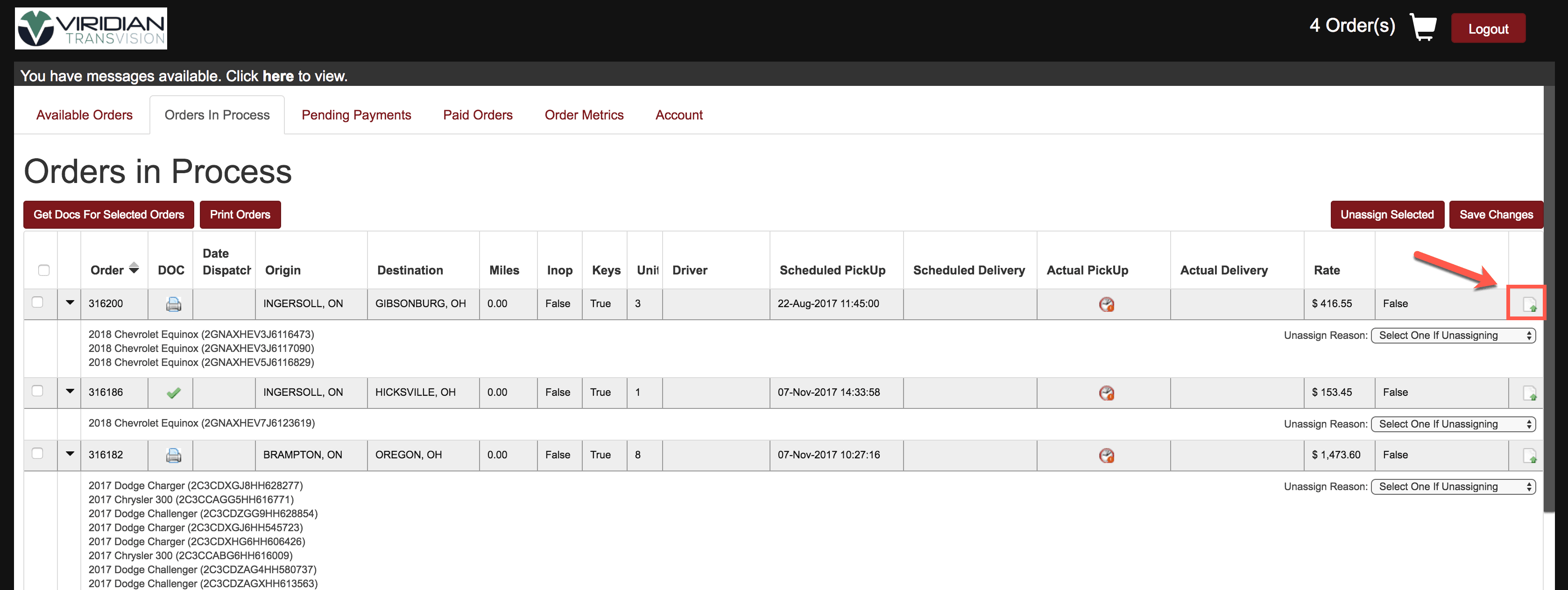 1. Click on the document icon to the far-right of the order you want the document to be associated with.