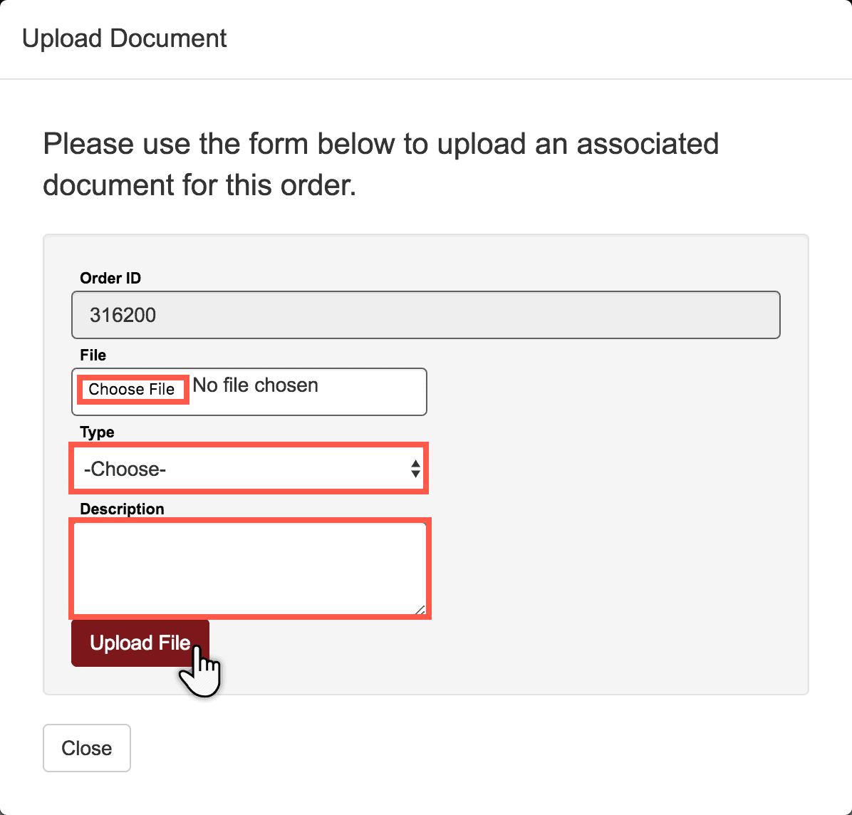 You can upload documents that are associated with an order in the Orders In Process tab or the Pending Payments tab.