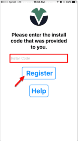 5. Enter the install code that has been provided to you by the dispatch company and click Register. If the install code is not