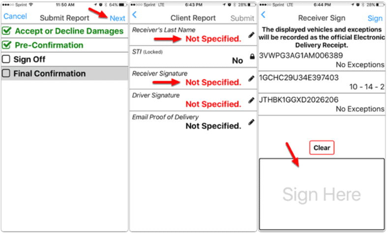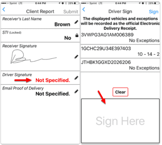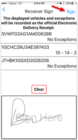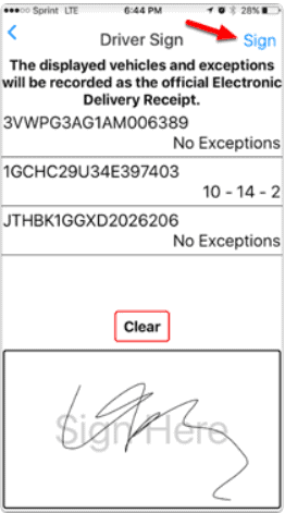 5. Click on Driver Signature, review the vehicles and listed exceptions then sign in the space provided.