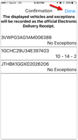 1. Review the vehicles and exceptions and click Done in the top-right corner.